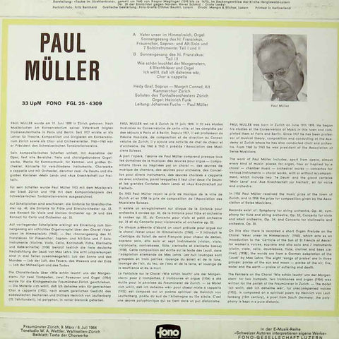 Paul Müller-Zürich (19. 06. 1898 - 21. 07. 1993) wurde in Zürich geboren. Er studierte am Konservatorium Zürich bei Philipp Jarnach und Volkmar Andreae sowie später in Paris. 1927 wurde er Lehrer am Konservatorium Zürich. Als Lehrer, Dirigent, Komponist und Organisator war er eine der bedeutendsten Persönlichkeiten im Schweizer Musikleben des 20. Jahrhunderts. 1953 erhielt Müller den Musikpreis der Stadt Zürich, 1958 den Kompositionspreis des schweizerischen Tonkünstlervereins, dessen Präsident er 1960 wurde. Müllers Oeuvre umschliesst nahezu alle Gattungen; heute sind seine Orgelwerke besonders bekannt. Paul Müller-Zürich starb in Luzern (Quelle: sme-musinfo)